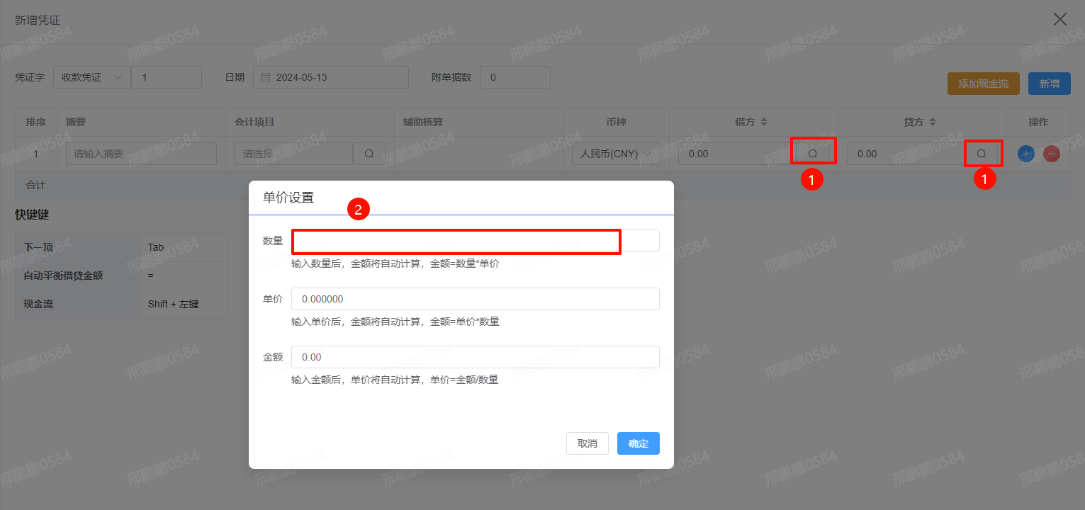 设置金额后,再点击按钮设置数量(保留5位有效小数),尽量不要手动修改单价(以金额、数量为准)