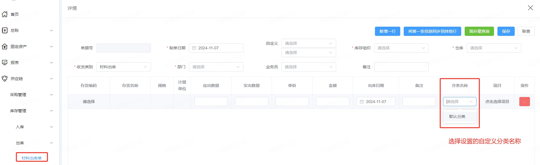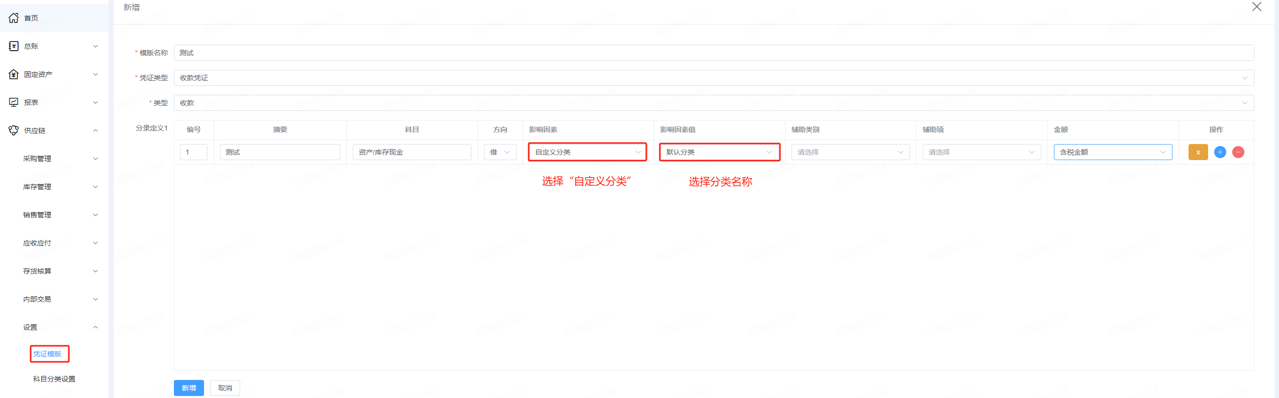 供应链中新增凭证模板时,如果存货分类影响因素不可以实现单独匹配科目需求时,可以使用自定义分类影响因素来实现 使用方法 首先在科目分类设置中新增自定义分类 然后再凭证模板中选择自定义分类影响因素和因素值 在库存材料出库单中,设置每一行存货的分类名称 注意 确保不要和其它公式行重复,避免数据重复计算 目前仅支持材料出库单的成本计算使用